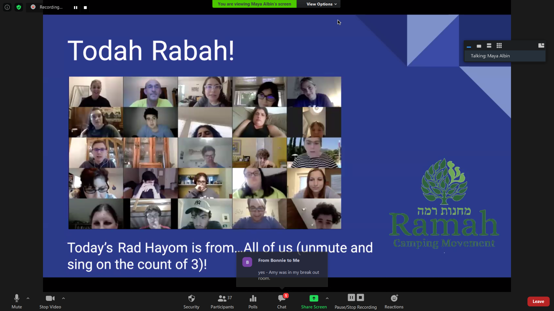 What we hadn’t anticipated is just HOW important this program would become in the lives of the participants and their families. The program offered reliability and predictability during uncertain times, it offered friendship and conversation during a summer when in-person socializing wasn’t possible. The program expanded the world of our participants. For example, worlds expanded when participants realized it was dark in Boston but still late afternoon in Sacramento! During socializing times, they shared news of birthdays, vacations, and pets. They talked about their own camp experiences and listened to the slightly different but very similar experiences in other Ramah camps. They sang Rad Hayom at the end of each session—a song we sing in all of our camps, with ever so slightly different edah (division) names!